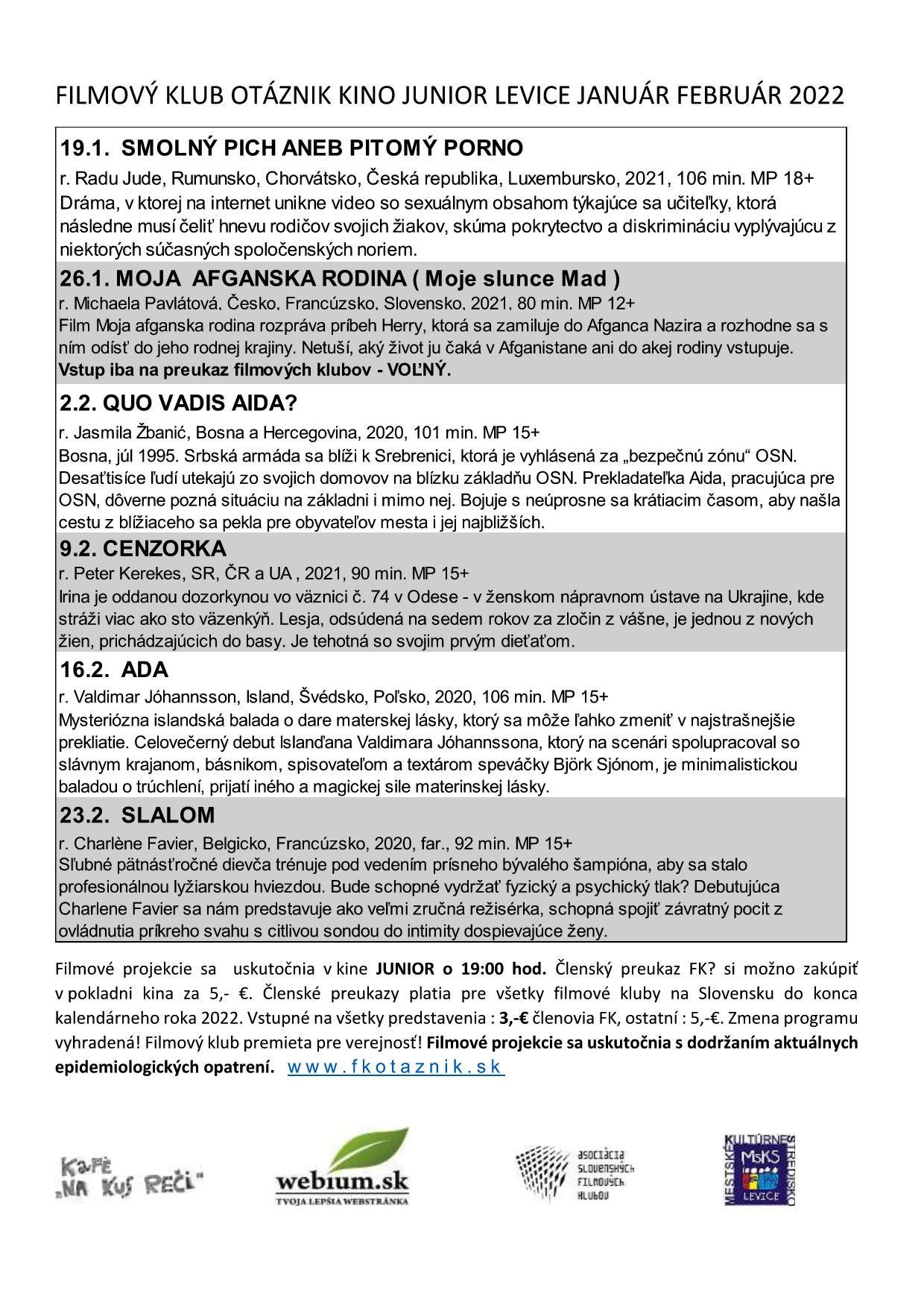 LEVICE 14. januára 2022 - Prinášame Vám program kina Junior Levice na obdobie od 15. do 23.1.2022 + program filmového klubu Otáznik na január a február 2022.