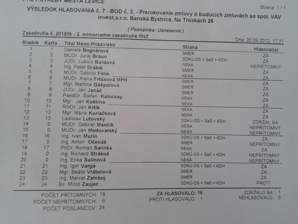 Prikladáme aj výsledok hlasovania č.7 . Bod č.3 - Prerokovanie zmluvy o budúcich zmluvách so spoločnosťou Vav invest s.r.o., ktorým poslanci zrušili predkupné právo v prospech mesta Levice a prijali alternatívu č.3.